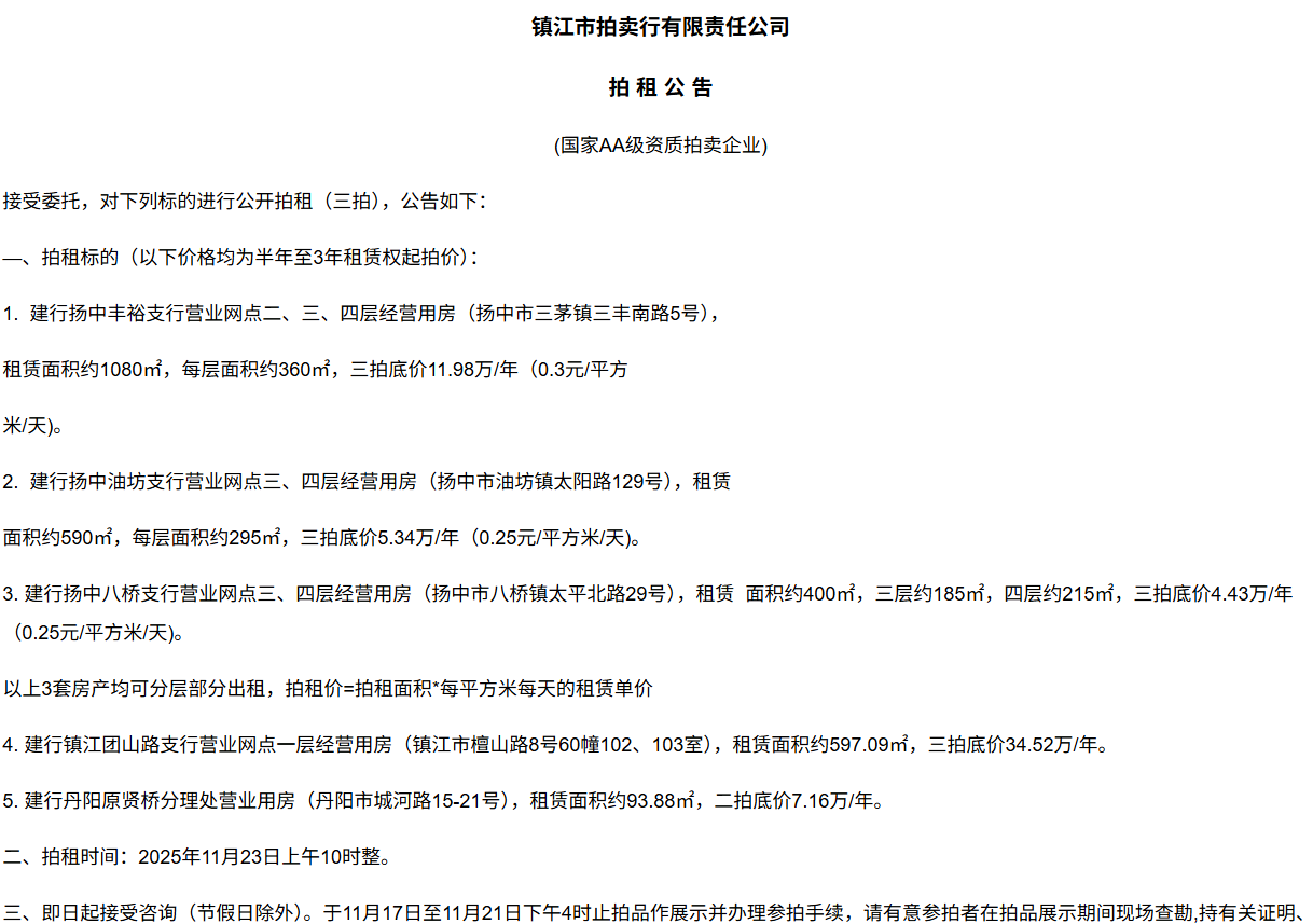 鎮(zhèn)江市拍賣(mài)行有限責(zé)任公司拍 租 公 吿(國(guó)家AA級(jí)資質(zhì)拍賣(mài)企業(yè))接受委托,對(duì)下列標(biāo)的進(jìn)行公開(kāi)拍租(三拍),公告如下:—、拍租標(biāo)的(以下價(jià)格均為半年至3年租賃權(quán)起拍價(jià)):1.  建行揚(yáng)中豐裕支行營(yíng)業(yè)網(wǎng)點(diǎn)二、三、四層經(jīng)營(yíng)用房(揚(yáng)中市三茅鎮(zhèn)三豐南路5號(hào)),租賃面積約1080㎡,每層面積約360㎡,三拍底價(jià)11.98萬(wàn)/年(0.3元/平方米/天)。2.  建行揚(yáng)中油坊支行營(yíng)業(yè)網(wǎng)點(diǎn)三、四層經(jīng)營(yíng)用房(揚(yáng)中市油坊鎮(zhèn)太陽(yáng)路129號(hào)),租賃面積約590㎡,每層面積約295㎡,三拍底價(jià)5.34萬(wàn)/年(0.25元/平方米/天)。3. 建行揚(yáng)中八橋支行營(yíng)業(yè)網(wǎng)點(diǎn)三、四層經(jīng)營(yíng)用房(揚(yáng)中市八橋鎮(zhèn)太平北路29號(hào)),租賃  面積約400㎡,三層約185㎡,四層約215㎡,三拍底價(jià)4.43萬(wàn)/年(0.25元/平方米/天)。以上3套房產(chǎn)均可分層部分出租,拍租價(jià)=拍租面積*每平方米每天的租賃單價(jià)4. 建行鎮(zhèn)江團(tuán)山路支行營(yíng)業(yè)網(wǎng)點(diǎn)一層經(jīng)營(yíng)用房(鎮(zhèn)江市檀山路8號(hào)60幢102、103室),租賃面積約597.09㎡,三拍底價(jià)34.52萬(wàn)/年。5. 建行丹陽(yáng)原賢橋分理處營(yíng)業(yè)用房(丹陽(yáng)市城河路15-21號(hào)),租賃面積約93.88㎡,二拍底價(jià)7.16萬(wàn)/年。二、拍租時(shí)間:2025年11月23日上午10時(shí)整。三、即日起接受咨詢(節(jié)假日除外)。于11月17日至11月21日下午4時(shí)止拍品作展示并辦理參拍手續(xù),請(qǐng)有意參拍者在拍品展示期間現(xiàn)場(chǎng)查勘,持有關(guān)證明、簽署相關(guān)說(shuō)明、繳納相應(yīng)的參拍保證金辦理參拍手續(xù)。四、咨詢、拍租地點(diǎn):鎮(zhèn)江市長(zhǎng)江路9號(hào)五、聯(lián)系方式:0511-85275988   13655299933楊先生六、網(wǎng)址:http://www_zjauction_net.globalaerosupport.com;微信公眾號(hào):搜索“鎮(zhèn)江市拍賣(mài)行” 拍品清單2025.11.23序號(hào)名稱起拍價(jià)(元)標(biāo)的說(shuō)明1建行揚(yáng)中豐裕支行營(yíng)業(yè)網(wǎng)點(diǎn)二、三、四層經(jīng)營(yíng)用房(揚(yáng)中市三茅鎮(zhèn)三豐南路5號(hào)),租賃面積約1080㎡,每層面積約360㎡三拍底價(jià)11.98萬(wàn)/年(0.3元/平方米/天)1、1-3號(hào)房產(chǎn)均可分層部分出租,拍租價(jià)=拍租面積*每平方米每天的租賃單價(jià);2、意向競(jìng)拍人在拍賣(mài)前需持營(yíng)業(yè)執(zhí)照或身份證與委托方說(shuō)明租賃房產(chǎn)經(jīng)營(yíng)業(yè)態(tài),確定意向后出具房產(chǎn)承租用途承諾書(shū),經(jīng)委托方審核后,方可交納保證金參加競(jìng)拍;3、租賃期限為半年至3年(承租方與出租方協(xié)商而定),承租方每半年或一年結(jié)付租金,租賃期間的水、電費(fèi)用及其它相關(guān)費(fèi)用均由承租方承擔(dān);4、承租方不得用于經(jīng)營(yíng)和保管危險(xiǎn)物品,不得用于開(kāi)設(shè)餐飲、娛樂(lè)等可能?chē)?yán)重影響消防安全、運(yùn)營(yíng)安全的經(jīng)營(yíng)業(yè)態(tài),不得用于經(jīng)營(yíng)委托貸款、小額貸款等可能冒用委托方名義,帶來(lái)聲譽(yù)風(fēng)險(xiǎn)的經(jīng)營(yíng)業(yè)態(tài)。租賃期內(nèi),承租方不得破壞墻體結(jié)構(gòu),自行成就消防、安全等使用條件,不得擅自將租賃房屋轉(zhuǎn)租、轉(zhuǎn)讓給他人使用,否則委托方有權(quán)收回房屋;5、拍租成交后,承租方將租金交至出租方指定賬戶,傭金交至拍賣(mài)方賬戶(拍租傭金為該房屋一個(gè)月租金)。承租方憑租賃合同無(wú)息退還保證金。2建行揚(yáng)中油坊支行營(yíng)業(yè)網(wǎng)點(diǎn)三、四層經(jīng)營(yíng)用房(揚(yáng)中市油坊鎮(zhèn)太陽(yáng)路129號(hào)),租賃面積約590㎡,每層面積約295㎡三拍底價(jià)5.34萬(wàn)/年(0.25元/平方米/天)3建行揚(yáng)中八橋支行營(yíng)業(yè)網(wǎng)點(diǎn)三、四層經(jīng)營(yíng)用房(揚(yáng)中市八橋鎮(zhèn)太平北路29號(hào)),租賃面積約490㎡,每層面積約245㎡三拍底價(jià)4.43萬(wàn)/年(0.25元/平方米/天)4建行鎮(zhèn)江團(tuán)山路支行營(yíng)業(yè)網(wǎng)點(diǎn)一層經(jīng)營(yíng)用房(鎮(zhèn)江市檀山路8號(hào)60幢102、103室),建筑面積約597.09㎡三拍底價(jià)34.52萬(wàn)/年5建行丹陽(yáng)原賢橋分理處營(yíng)業(yè)用房(丹陽(yáng)市城河路15-21號(hào)),建筑面積約93.88㎡二拍底價(jià)7.16萬(wàn)/年