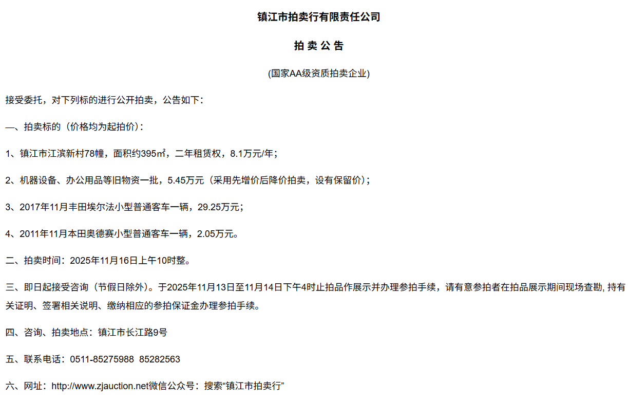 鎮(zhèn)江市拍賣(mài)行有限責(zé)任公司拍 賣(mài) 公 吿(國(guó)家AA級(jí)資質(zhì)拍賣(mài)企業(yè))接受委托,對(duì)下列標(biāo)的進(jìn)行公開(kāi)拍賣(mài),公告如下:—、拍賣(mài)標(biāo)的(價(jià)格均為起拍價(jià)):1、鎮(zhèn)江市江濱新村78幢,面積約395㎡,二年租賃權(quán),8.1萬(wàn)元/年;2、機(jī)器設(shè)備、辦公用品等舊物資一批,5.45萬(wàn)元(采用先增價(jià)后降價(jià)拍賣(mài),設(shè)有保留價(jià));3、2017年11月豐田埃爾法小型普通客車(chē)一輛,29.25萬(wàn)元;4、2011年11月本田奧德賽小型普通客車(chē)一輛,2.05萬(wàn)元。二、拍賣(mài)時(shí)間:2025年11月16日上午10時(shí)整。三、即日起接受咨詢(節(jié)假日除外)。于2025年11月13日至11月14日下午4時(shí)止拍品作展示并辦理參拍手續(xù),請(qǐng)有意參拍者在拍品展示期間現(xiàn)場(chǎng)查勘, 持有關(guān)證明、簽署相關(guān)說(shuō)明、繳納相應(yīng)的參拍保證金辦理參拍手續(xù)。四、咨詢、拍賣(mài)地點(diǎn):鎮(zhèn)江市長(zhǎng)江路9號(hào)五、聯(lián)系電話:0511-85275988  85282563 六、網(wǎng)址:http://www_zjauction_net.globalaerosupport.com微信公眾號(hào):搜索“鎮(zhèn)江市拍賣(mài)行”